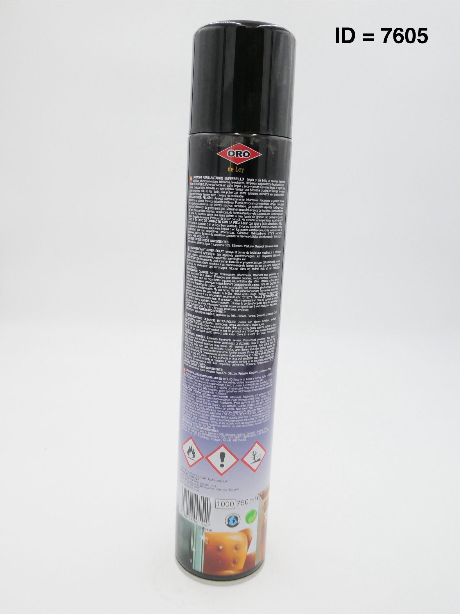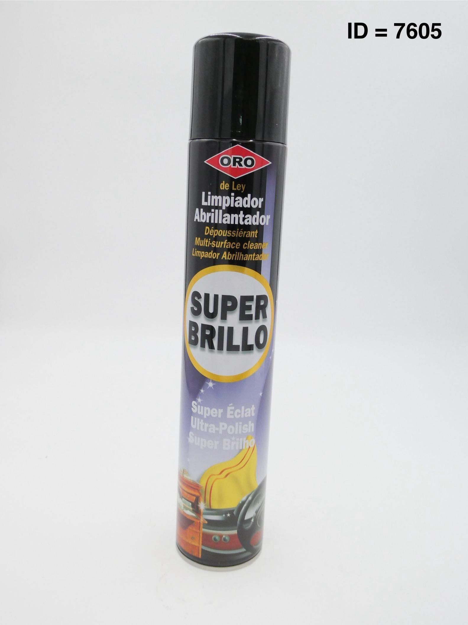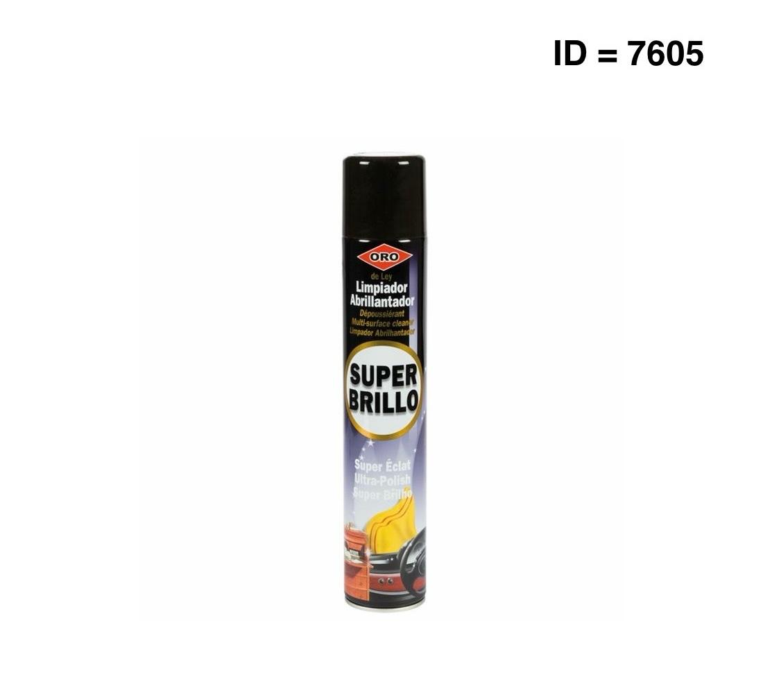 Gold Super Shine En spray qui nettoie et polit les vehicles, meubles, les tissus d'ameublement, les appareils électroménagers et les téléviseurs. Marque : ORO Le nettoyant polissant super brillant ORO est spécialement formulé pour être utilisé sur les surfaces en bois ainsi que sur les tissus d'ameublement, les tableaux de bord et tous les types de surfaces synthétiques. MODE D'EMPLOI : Vaporiser sur un chiffon propre et sec, puis essuyer délicatement la surface à nettoyer. Sur les surfaces délicates, il est conseillé d'effectuer un petit test dans une zone cachée pour s'assurer de ne pas les endommager. Ne pas vaporiser sur des appareils électriques en fonctionnement. Conserver dans un endroit frais et sec. Emballage non réutilisable.