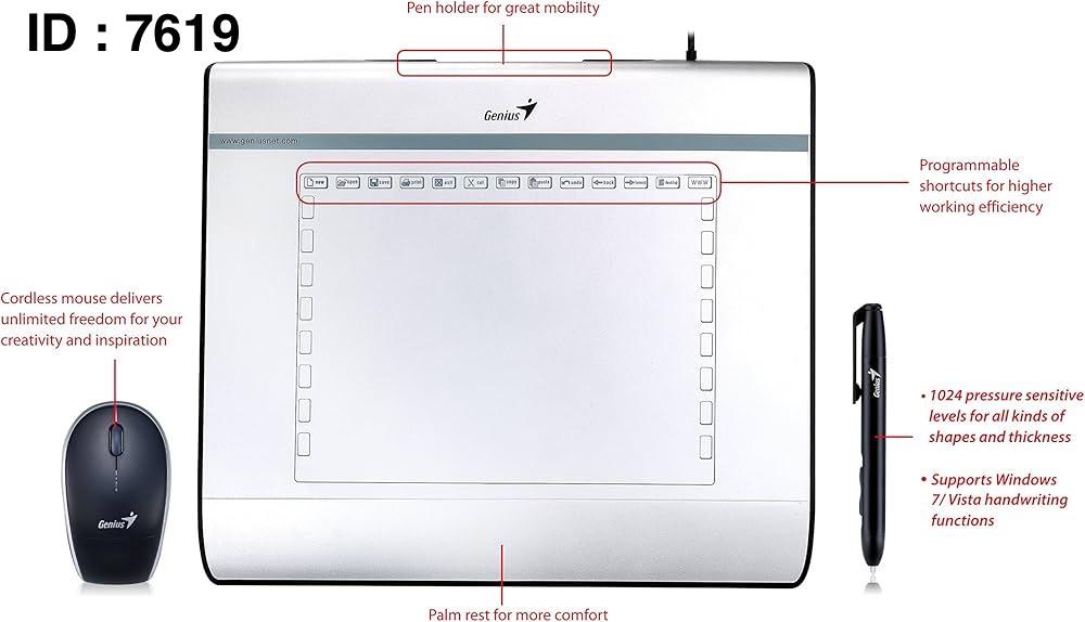 Marque : Génie Technologie de connectivité : USB sensibilité à la pression / 1024 niveaux Taille de l’écran : 150 millimètres Espace de travail pour dessin et écriture manuscrite : 240 x 300 mm Le plateau pour stylo graphique Genius i608 offre une portée active de 15 x 20 cm, idéale pour les travaux graphiques. Le stylet fourni permet d'activer l'une des 29 fonctions programmables d'un simple clic. La sensibilité à 1024 niveaux assure une précision maximale, et l'interface USB garantit une utilisation simple et intuitive. Optez pour un plateau graphique simple et performant avec le stylo graphique Genius i608 ! Sensibilité à la pression de 1024 niveaux pour toutes les formes et contrôle de l'épaisseur Notes ou dessins manuscrits efficacement dans les e-mails, MSN, documents ou tout autre programme d'application Souris sans fil à 3 touches avec défilement pour une navigation rapide sur Internet et dans les documents