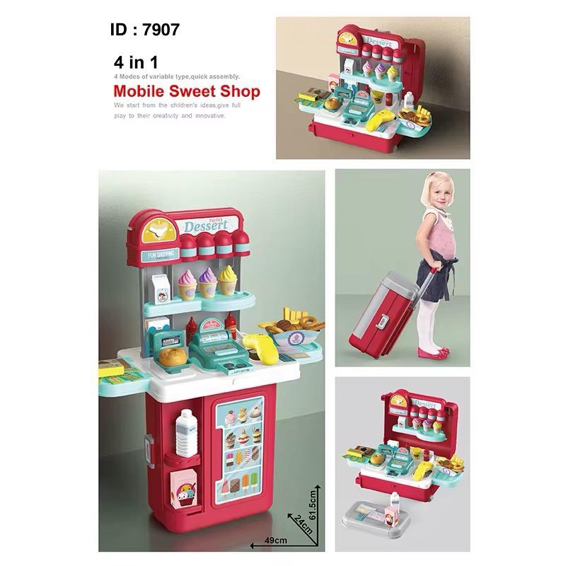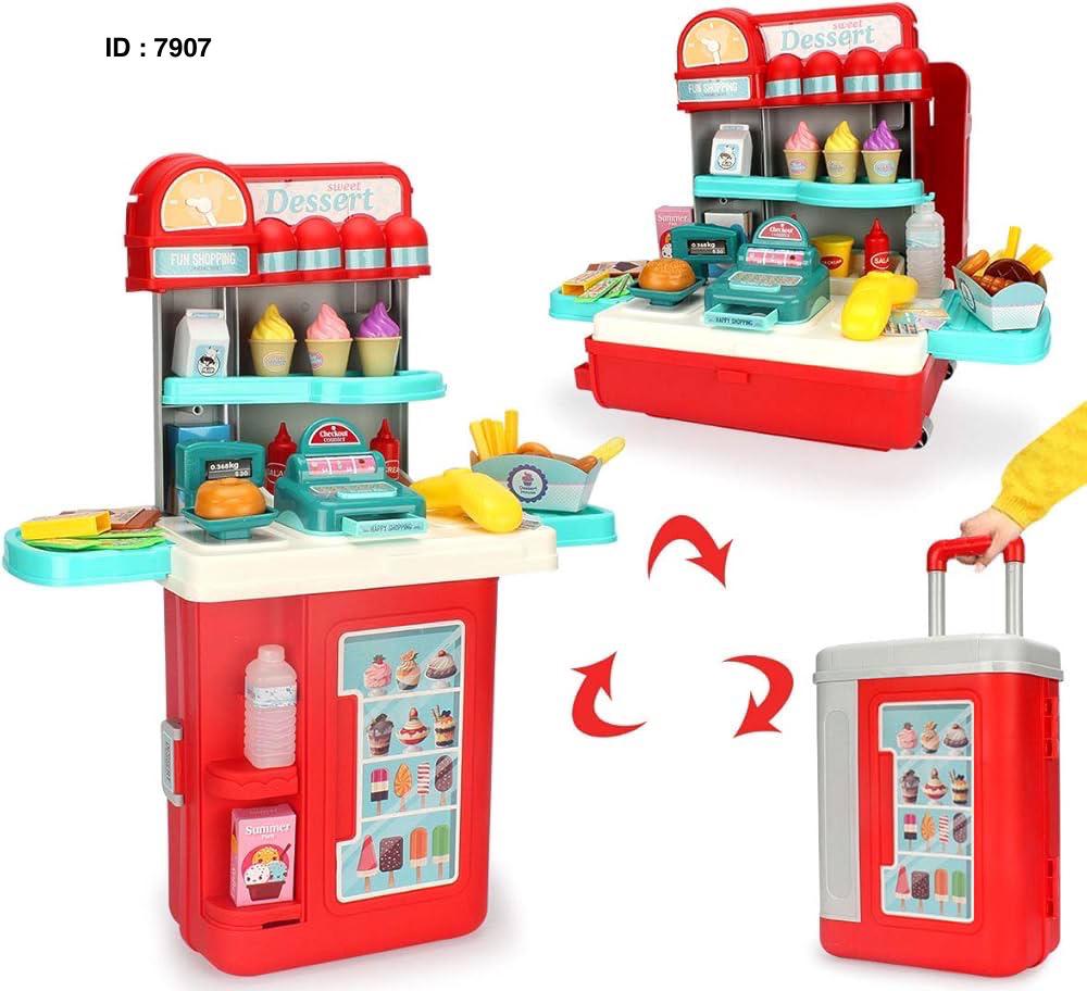 Fonction : Pretend Crème Glacée Confiserie Transformable Mallette De Voyage Jouet, Jeu De Rôle Pour Enfants Jouet Ensemble Fabriqué à partir de matériaux sûrs et écologiques, sûr et durable, jouet parfait Contient : 54 accessoires colorés, développent la pensée, le développement visuel magasins de bon multifonctionnel Ce joli magasin à roulettes est conçu avec un support qui permet aux petits enfants de vendre plus facilement des glaces et des bonbons. Peut être transformé en mallette de transport après démontage. Amusant : Faites comme s'il était un vendeur ; D'autres peuvent se vanter pendant que les acheteurs attendent pour acheter quelque chose avec le papier-monnaie et les pièces en plastique inclus. Les enfants développeront leur imagination, leur coordination œil-main et leurs compétences sociales avec ce jeu interactif.