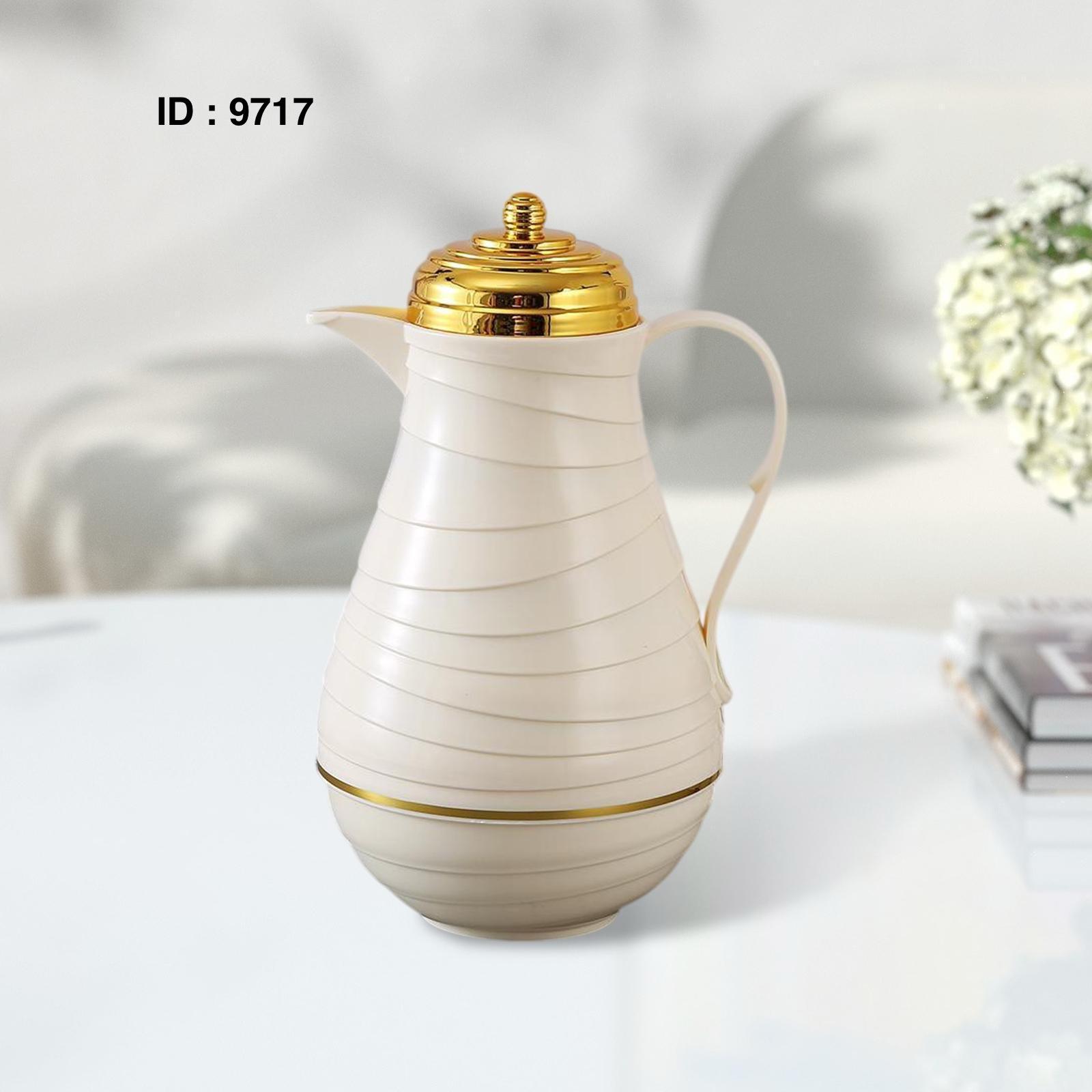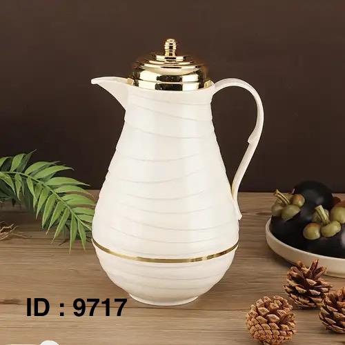 Style : arabe, souvent appelée "dallah" ou "thermos arabe". Elle est conçue pour maintenir les boissons chaudes ou froides pendant une longue période grâce à son isolation. Le design présenté est élégant, avec un corps de couleur claire et un couvercle doré, ce qui la rend adaptée pour le service à table.