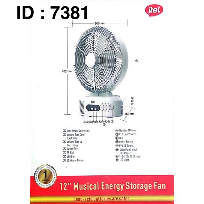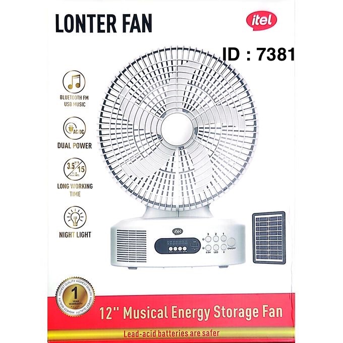 Marque : itel Taille : de 12 pouces, Il s'agit d'un ventilateur de table rechargeable de 12 pouces conçu pour un flux d'air supérieur. Fonctionnalités : Il intègre un panneau solaire pour la recharge, le Bluetooth, la radio FM et une lumière LED. Autonomie : La durée de fonctionnement dépend de la vitesse, mais il peut fonctionner jusqu'à 32 heures à basse vitesse et 4 heures à haute vitesse.