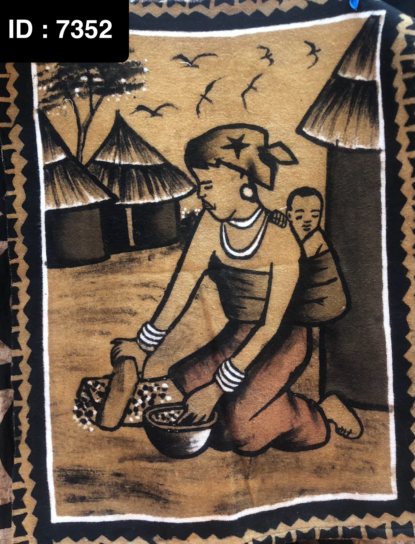 Tableau bogolan en tissu montrant une femme pillant avec son enfant attaché dans le dos… mettant ainsi en valeur l’attachement Danube mère à son enfants dans n’importe quelle situation même lors du travail #beproudofMali
