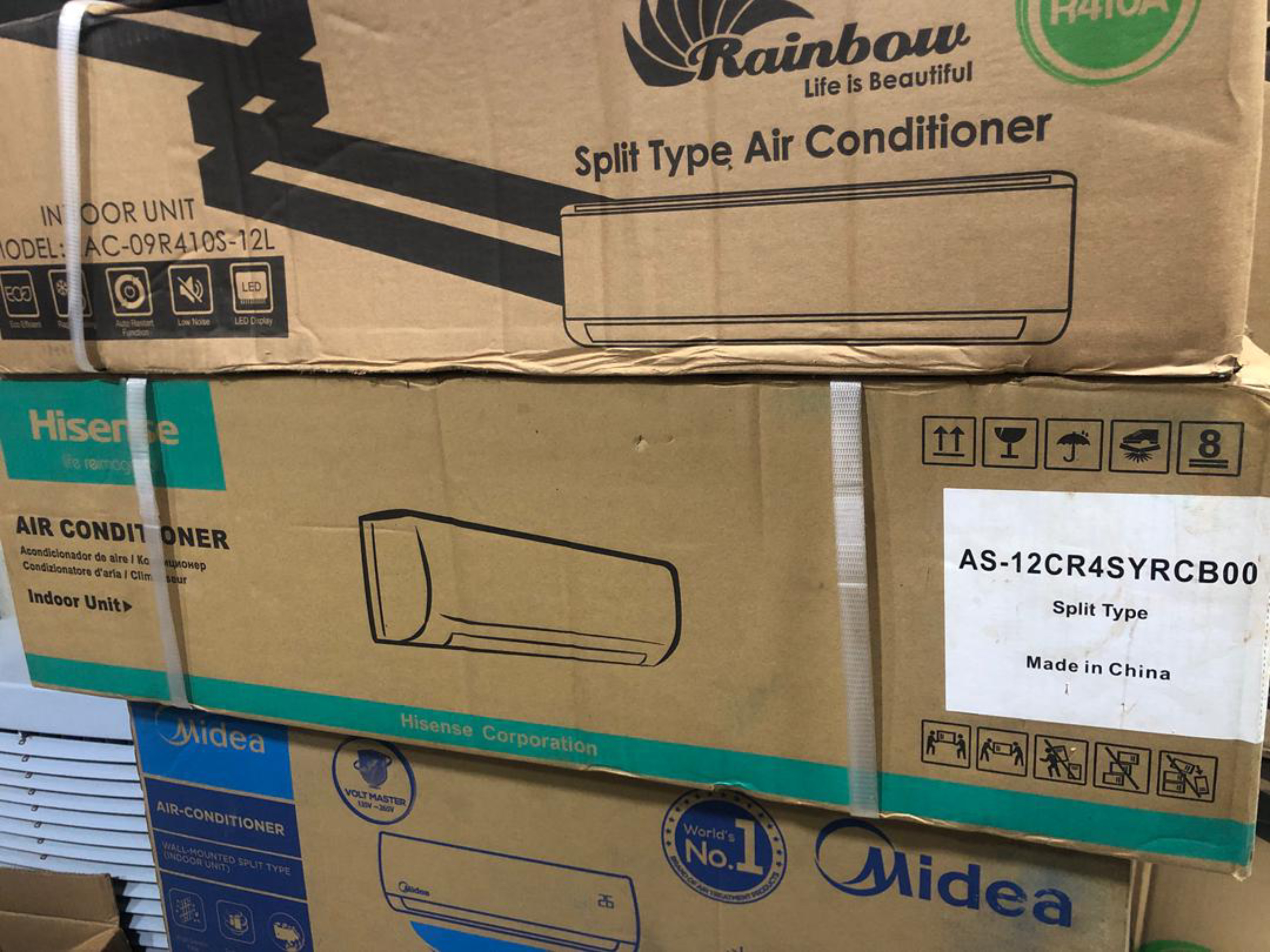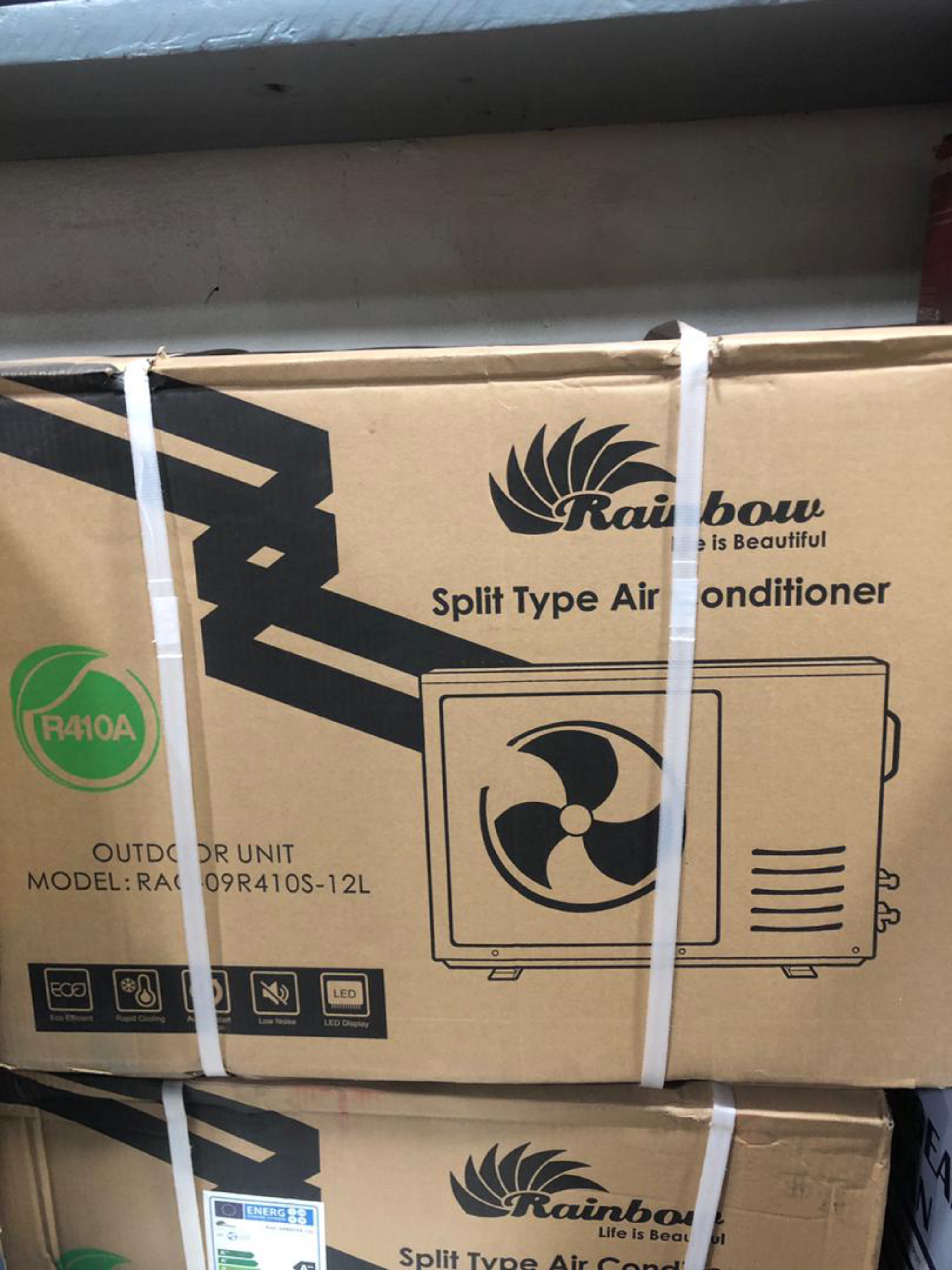 Climatiseur de type split, unité extérieure. Marque : Rainbow. Modèle : RAC 09R410S-12L.