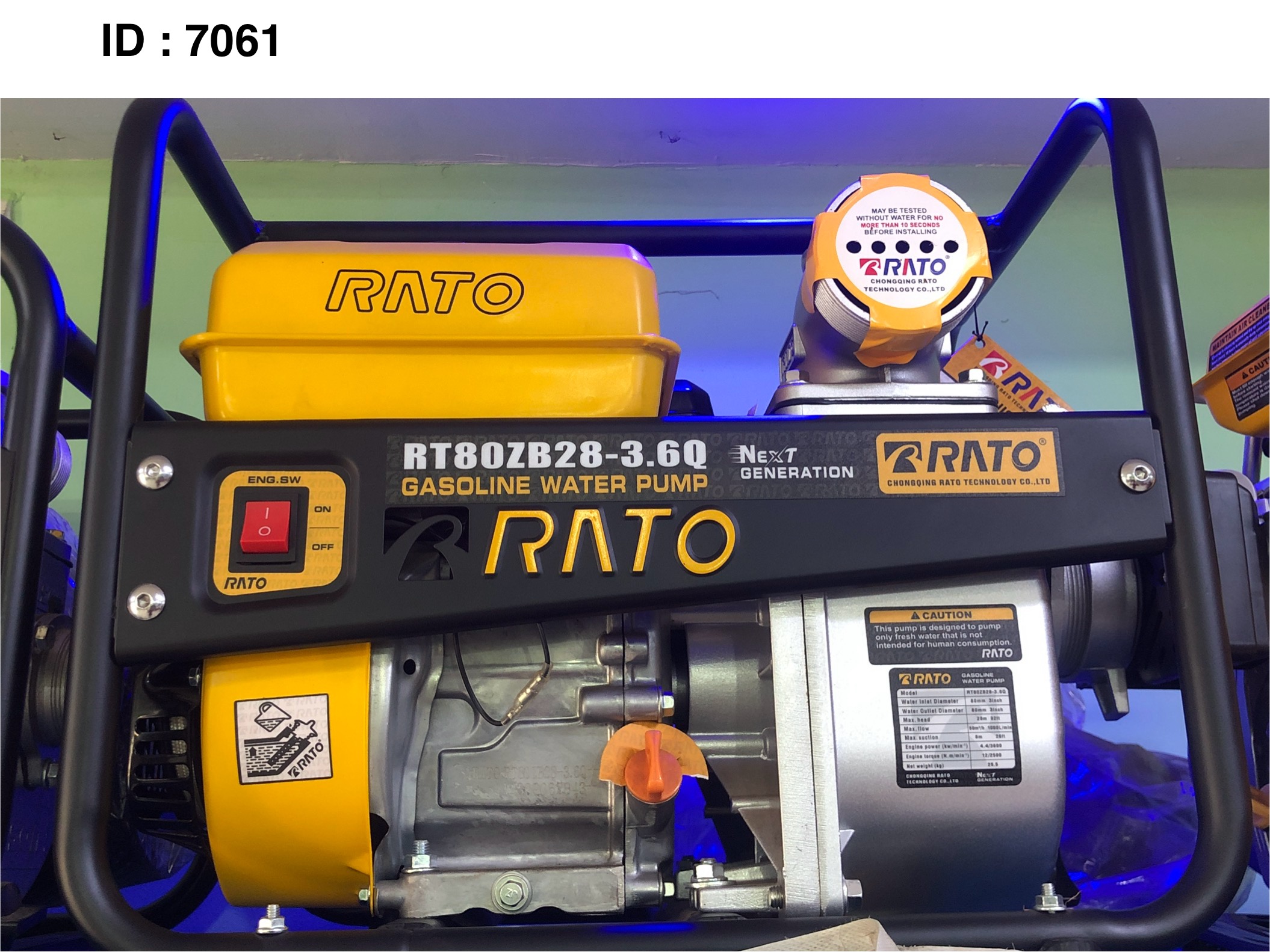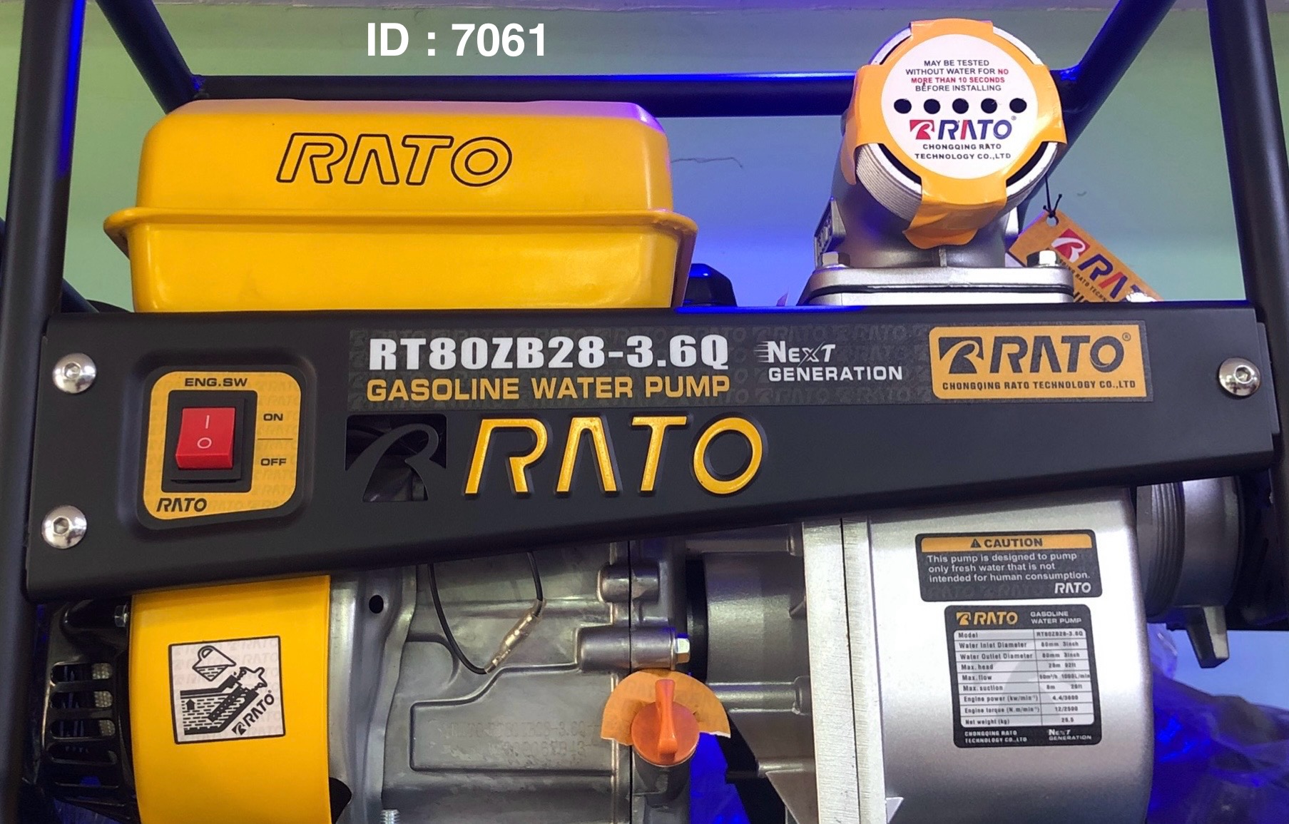 Marque : RATO RS100 de 3,0 CV, modèle RT80ZB28-3.6Q. Il s'agit d'une pompe à eau à essence conçue pour le pompage de l'eau. Ces pompes sont utilisées pour transporter de l'eau propre et d'autres liquides aux propriétés similaires.