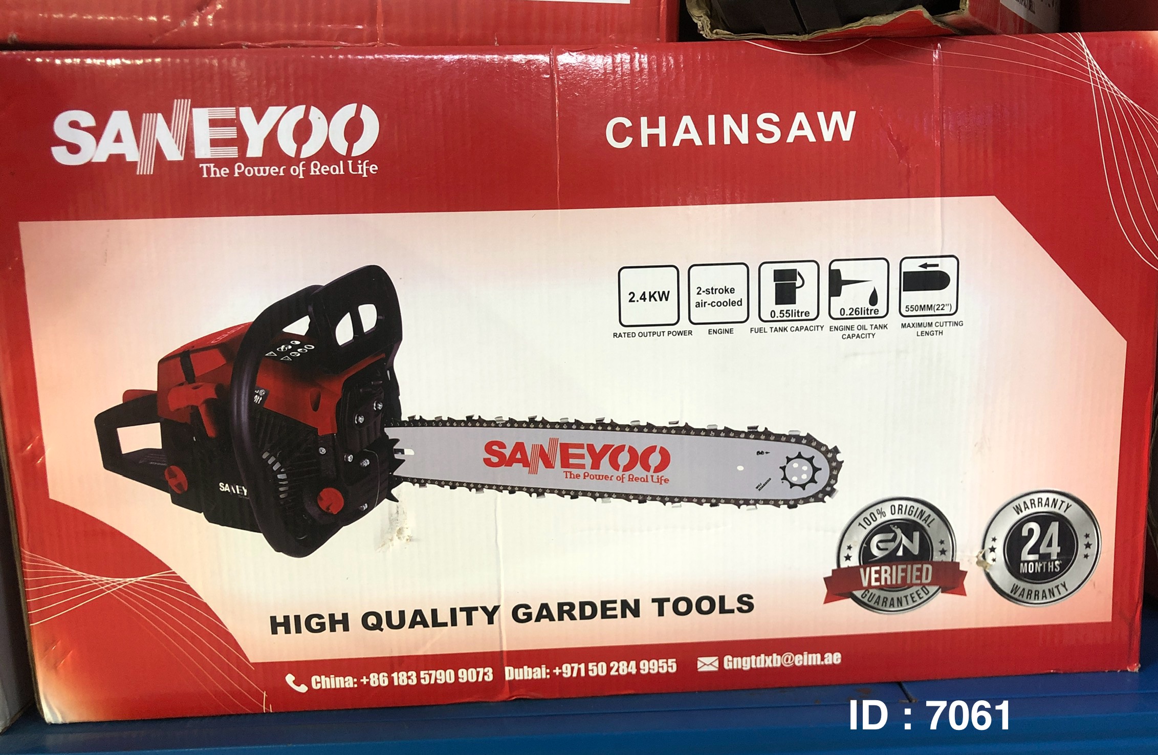 Marque : SANEYOO Caractéristiques techniques : Moteur 2 temps refroidi par air, puissance de 2,4 kW, capacité du réservoir de carburant de 0,55 litre, capacité du réservoir d'huile moteur de 0,26 litre, et une longueur de coupe maximale de 550 mm (22 pouces).
