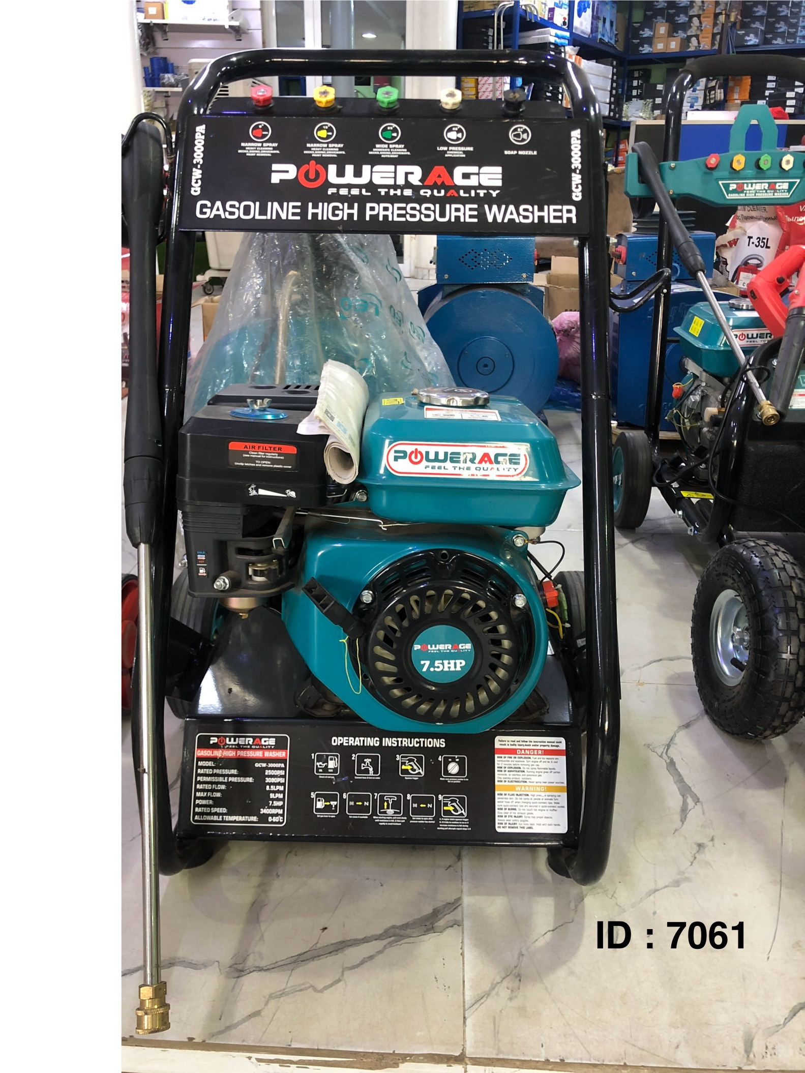 Marque et modèle : Powerage GCW-3000PA. Type : Nettoyeur haute pression à essence. Puissance : 7,5 chevaux (HP). Caractéristiques : Consommation de carburant inférieure à un litre par heure, réservoir de carburant d'environ 4 litres, lance métallique en acier avec buse en laiton, châssis robuste et roues industrielles, plusieurs buses adaptées à la température de l'eau. Utilisation : Idéal pour le nettoyage extérieur de divers objets ou surfaces nécessitant une forte pression d'eau.