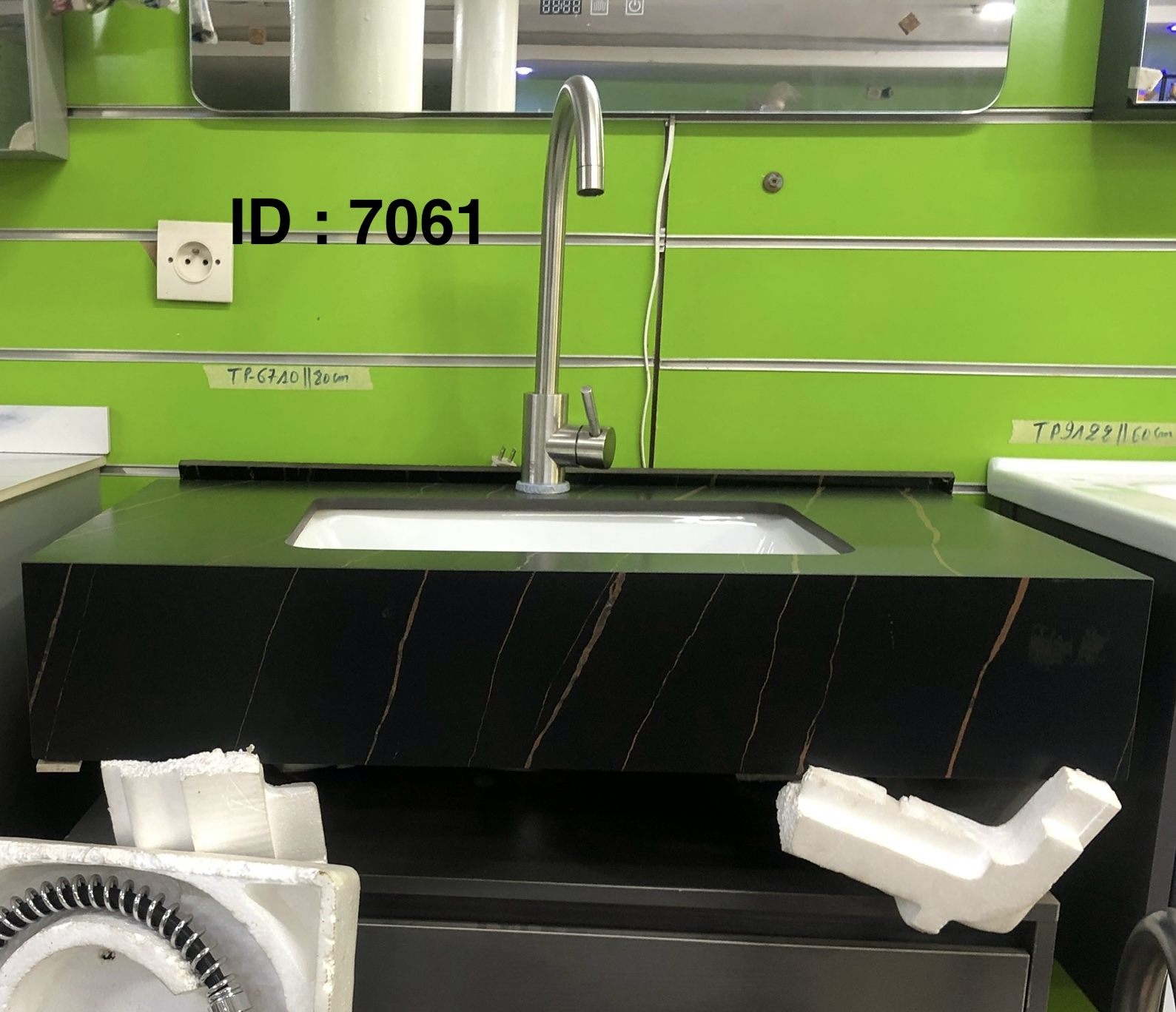 Meuble- lavabo de salle de bain avec un lavabo intégré et un robinet.