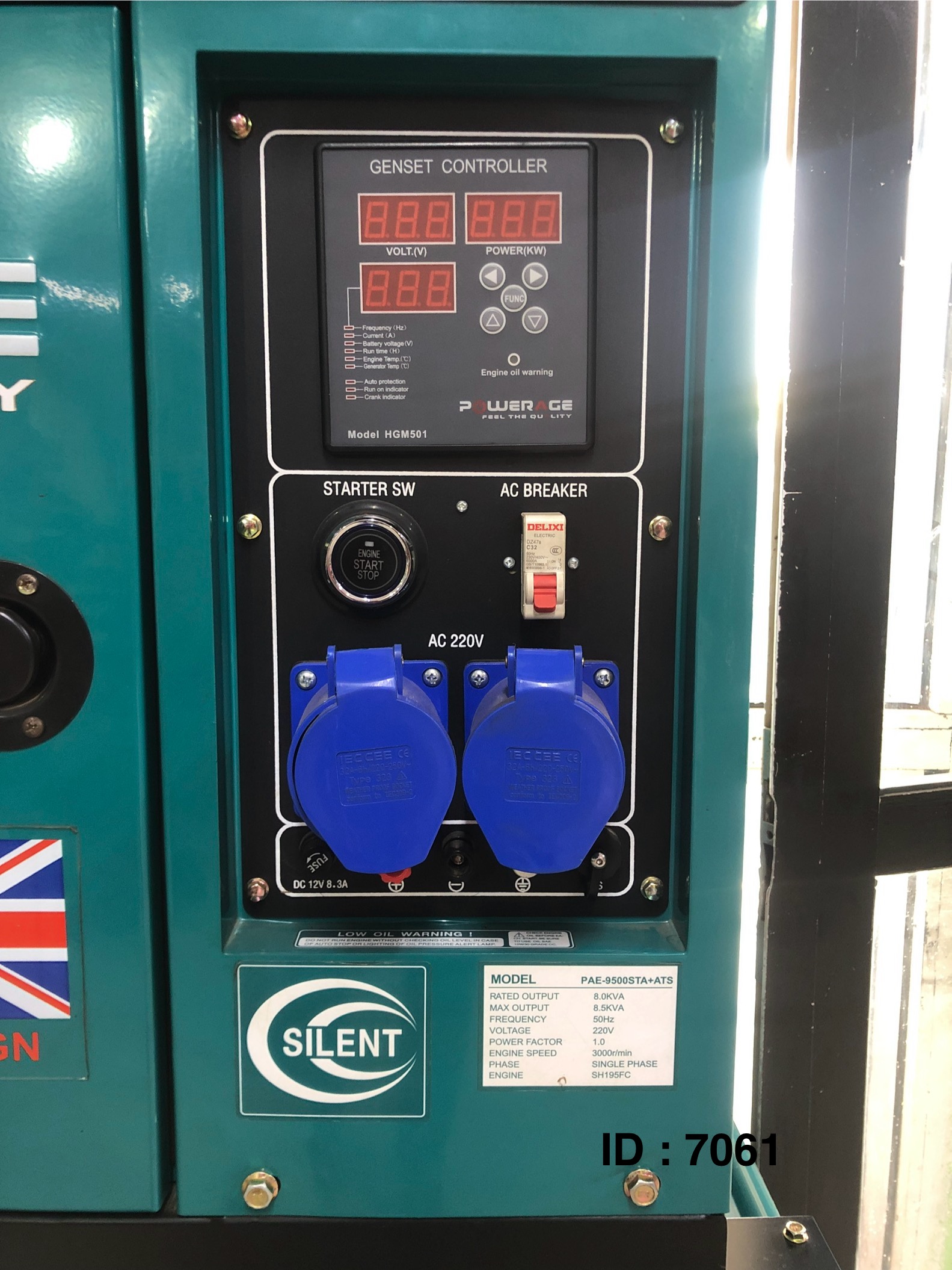 Powerage PAE-9500STA+ATS Puissance nominale : 8,0 KVA Puissance maximale : 8,5 KVA, fonctionnant à une fréquence de 50 Hz et une tension de 220V. Ce modèle est un groupe électrogène diesel avec démarrage automatique (ATS) et est conçu pour être "super silencieux". Il est certifié ISO 9001, ce qui indique un système de gestion de la qualité. assure une alimentation électrique. Continue en basculant automatiquement entre une source d'alimentation principale (comme le réseau électrique) et une source d'alimentation de secours