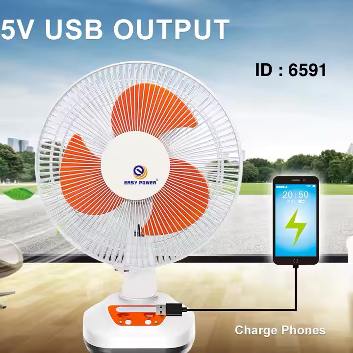 Ce ventilateur fonctionne à la fois sur courant alternatif (AC) et continu (DC), et est équipé d'une batterie rechargeable intégrée, potentiellement chargeable via un panneau solaire, mettre son telephone en charge et dispose d’un Led (lumière) Ce type de ventilateur est souvent conçu pour être portable et peut être utile en cas de coupures de courant ou pour une utilisation en extérieur.