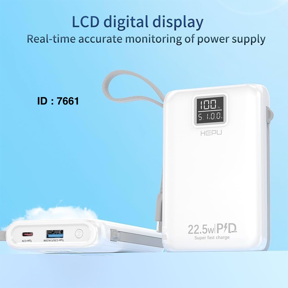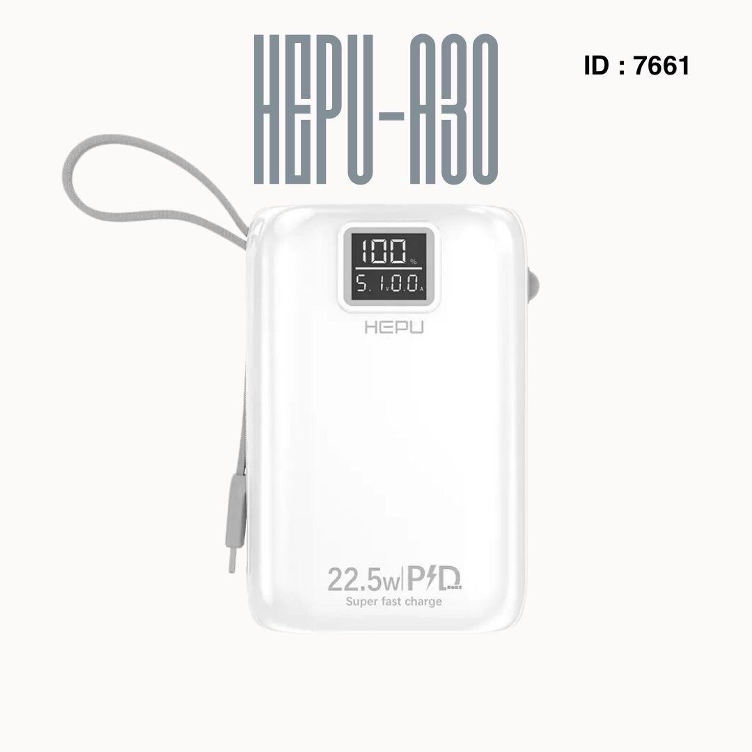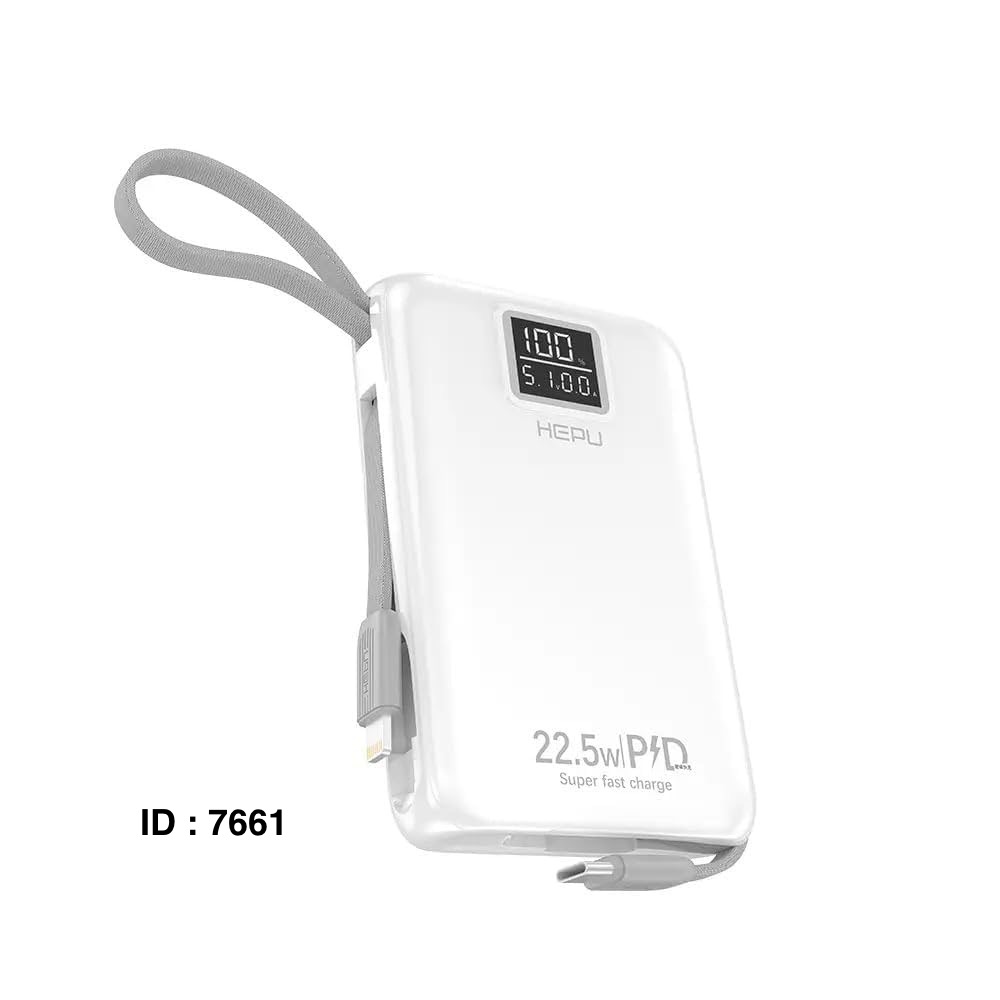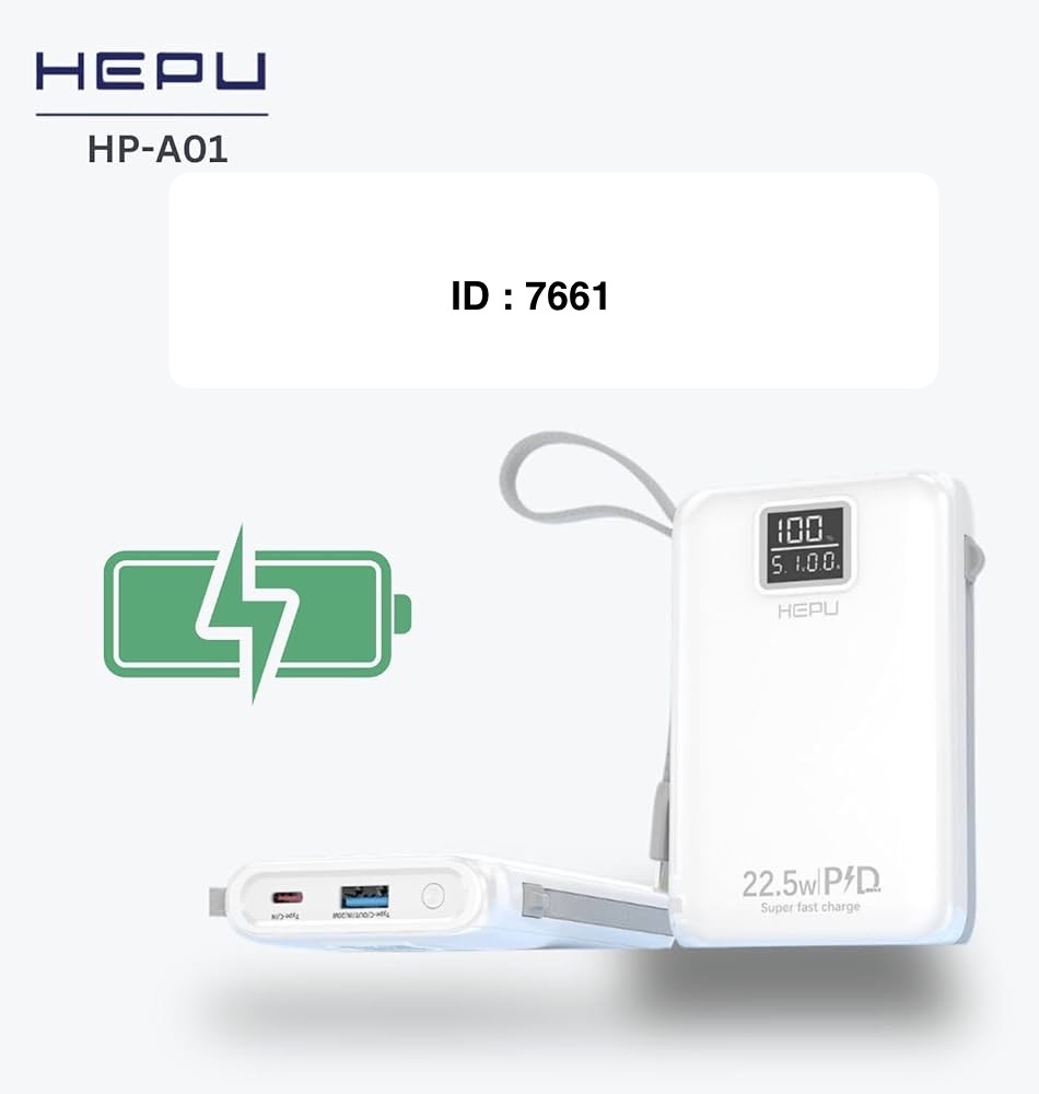 Marque : Hepu Capacité : 20 000 mAh, offrant plusieurs recharges complètes pour la plupart des smartphones. Disponible : 30.000mAh Fonctionnalités : Charge rapide PD 22.5W, ports USB et connecteurs intégrés (Type-C, iPhone, Micro USB).