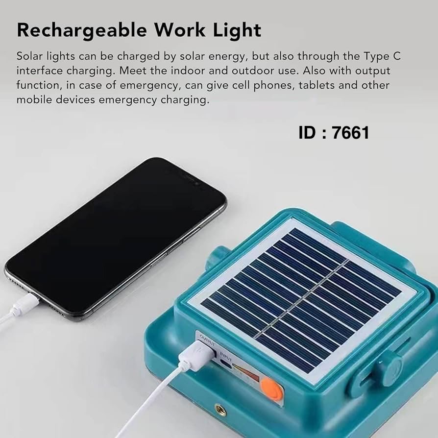 4 MODES D'ÉCLAIRAGE : La lampe solaire à LED a une lumière blanche, une lumière chaude, une lumière rouge et un mode d'éclairage clignotant à 4 vitesses, un bouton de commande à une touche, pour répondre à différents besoins d'éclairage. Idéal pour le camping, le travail de nuit et diverses activités dans l'obscurité. MODE DE CHARGEMENT : Les lampes solaires peuvent être alimentées par l'énergie solaire, mais aussi par l'interface de type C. Elles conviennent à une utilisation en intérieur comme en extérieur. Grâce à leur fonction de sortie, elles peuvent recharger d'urgence les téléphones portables, tablettes et autres appareils mobiles en cas d'urgence. Léger et portable : Compact et facile à transporter, ce projecteur LED est doté d'une poignée pliable qui permet de l'accrocher à une tente ou un arbre. Réglable grâce à l'écrou latéral, il s'adapte à l'angle souhaité. Son crochet dissimulé et esthétique permet de l'accrocher n'importe où.