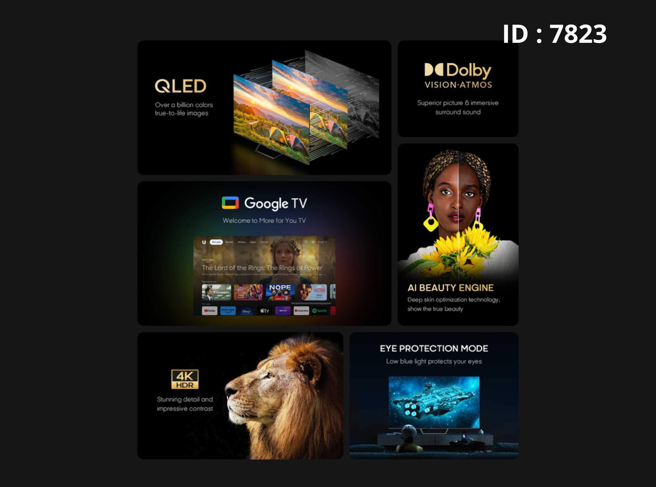 Smart TV Connectable WiFi : Oui Dimension : 65 pouces Ecran Type : QLED Systeme d'operation : Google TV Super vision - Technologie d'optimisation de la peau en profondeur Netflix, Youtube, Google Duo, Chromecast, 3 HDMI Ports