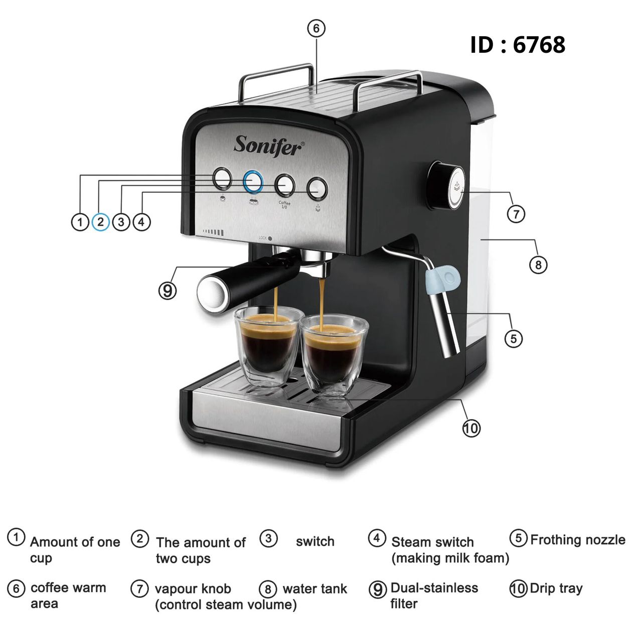 Capacité : 1,2 Litres ( réservoir d’eau détachable) Peut faire espresso et cappuccino Peut faire du café avec du café moulu Avec valve de sécurité, peut libérer automatiquement le dispositif de pression Durable pour les tasses de café pré-chauffées Sûr et fiable, avec dispositif protégé contre la surchauffe et la surpression