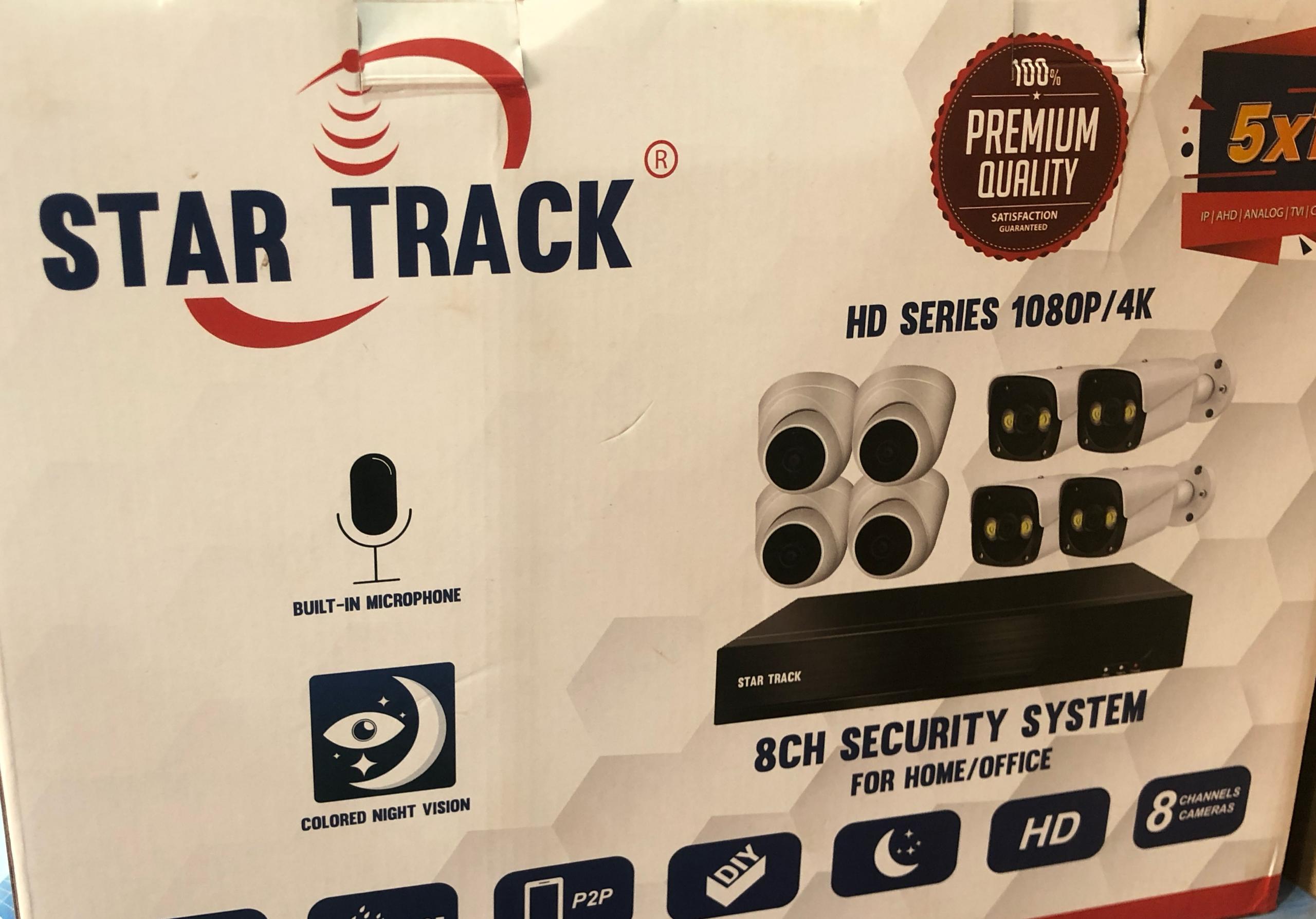 Marque : STAR TRACK Caméras Nombre : 8 Caméras (4 Bullet 4 Dômes) Résolution de Capteur : 2.0 Mégapixels HD / 3.6 mm Enregistrement Jour et Nuit Waterproof IP65 Alimentation : DC12V/AA DVR Vidéo out HDMI VGA BNC 2 USB Résolution : 1080P/4K Connectivité : Systèmes mobiles pris en charge: iOS, Android Accessoires 8 Câble Extension BNC avec Power Transformateur : 12V+2A Coquille transparente avec voyant d’alimentation