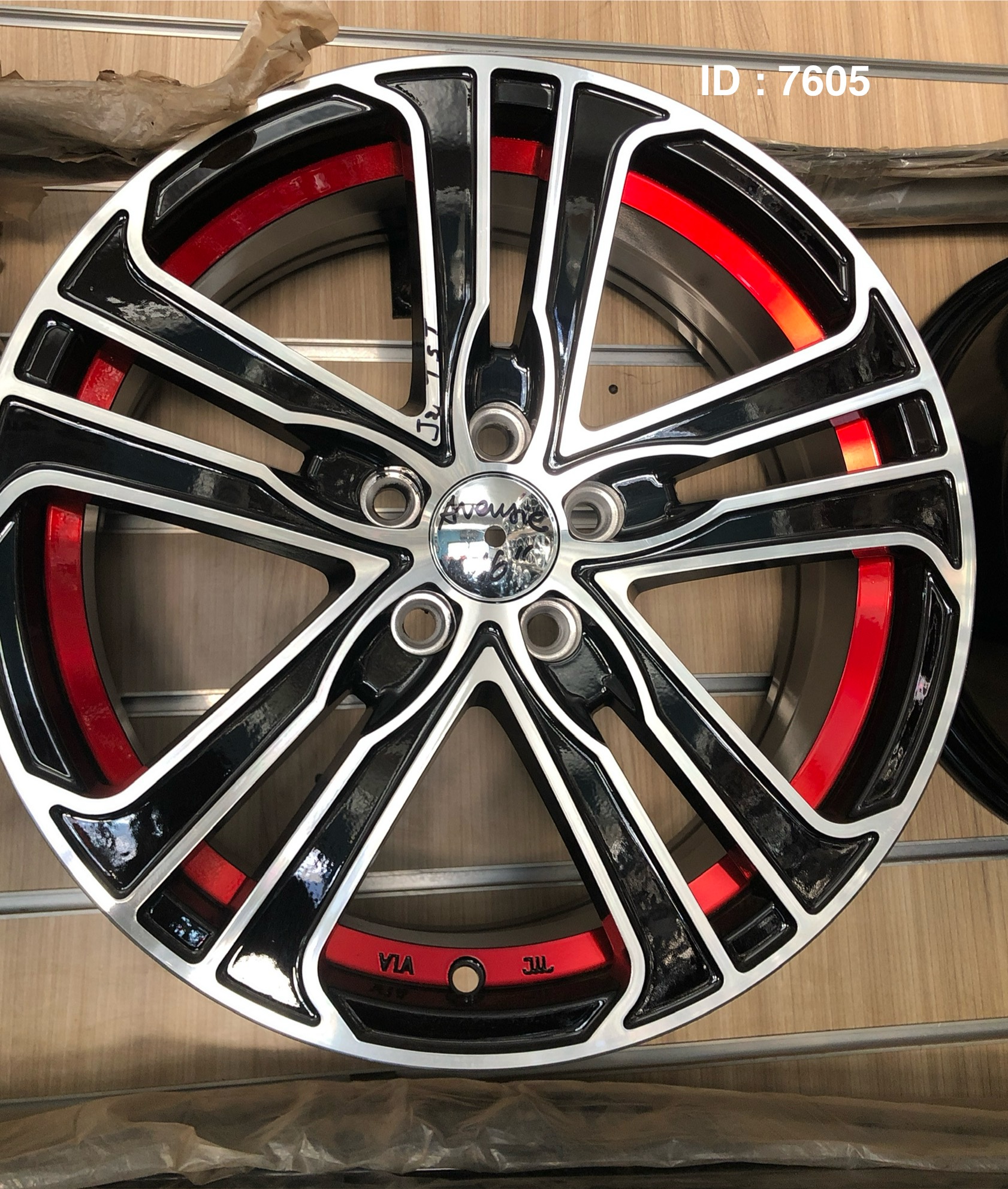 Il s'agit d'une jante en alliage, caractérisée par un design noir et rouge distinctif, avec des rayons multiples.