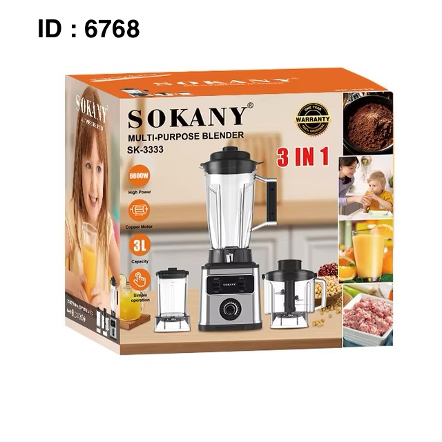 Marque : Sokany SK-3333 Fonctions : Il s'agit d'un mixeur multi-usages 3-en-1, avec des fonctions de mixage, de broyage et de pressage de jus. Puissance : Il est doté d'un moteur de 6600W Capacité : 3 Litres Disponible : 2.5 Litres Caractéristiques supplémentaires : Il possède un moteur en cuivre et est conçu pour une utilisation simple.